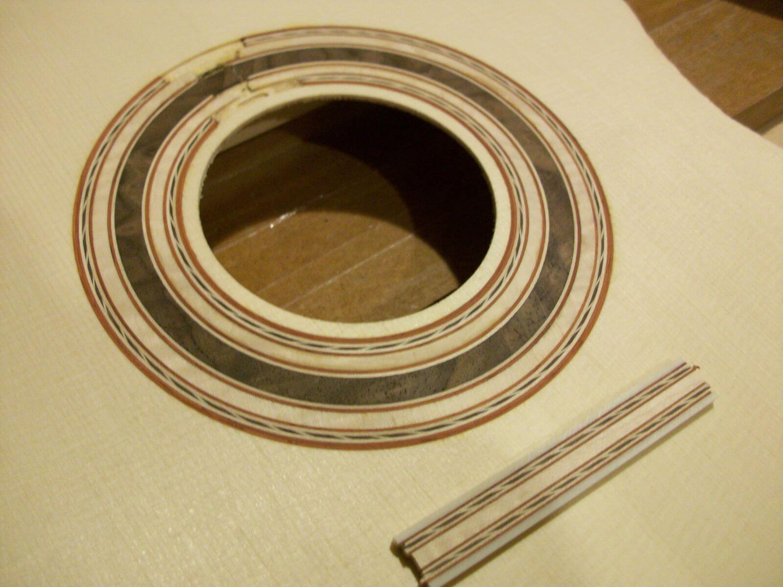 Pictured from left to right: The 2015 GFA Convention guitar rosette design with tie block and the rosette and tie block design for Alexander Rockwell's padauk build.