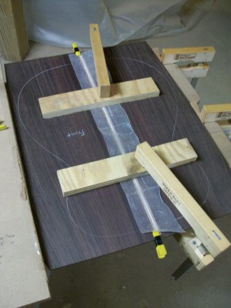The Clamp Guy: According to this Web site my theories about the antiquitiy of the clamp are somewhat on target. "Weights, Wedges and Wraps" are the terms that describe the "Pre-Screw" clamping technology. And the Go Bar Deck at left is definitely in this category. Interestly enough, luthiers (at least this one) still use all three of these clamping techniques. The go bar deck and my ancient method of joining the top and back are two different, yet perfectly ancient examples of wedging. And wraps? Actually, that's easy. The binding of a guitar is still applied using a wrap. While most of us are using masking tape, I am sure that there are still some luthiers out there using a long rubber wrap. And who hasn't leaned on a glue joint when the clamps ran out or couldn't fit? I think that can pass for a "weight".
