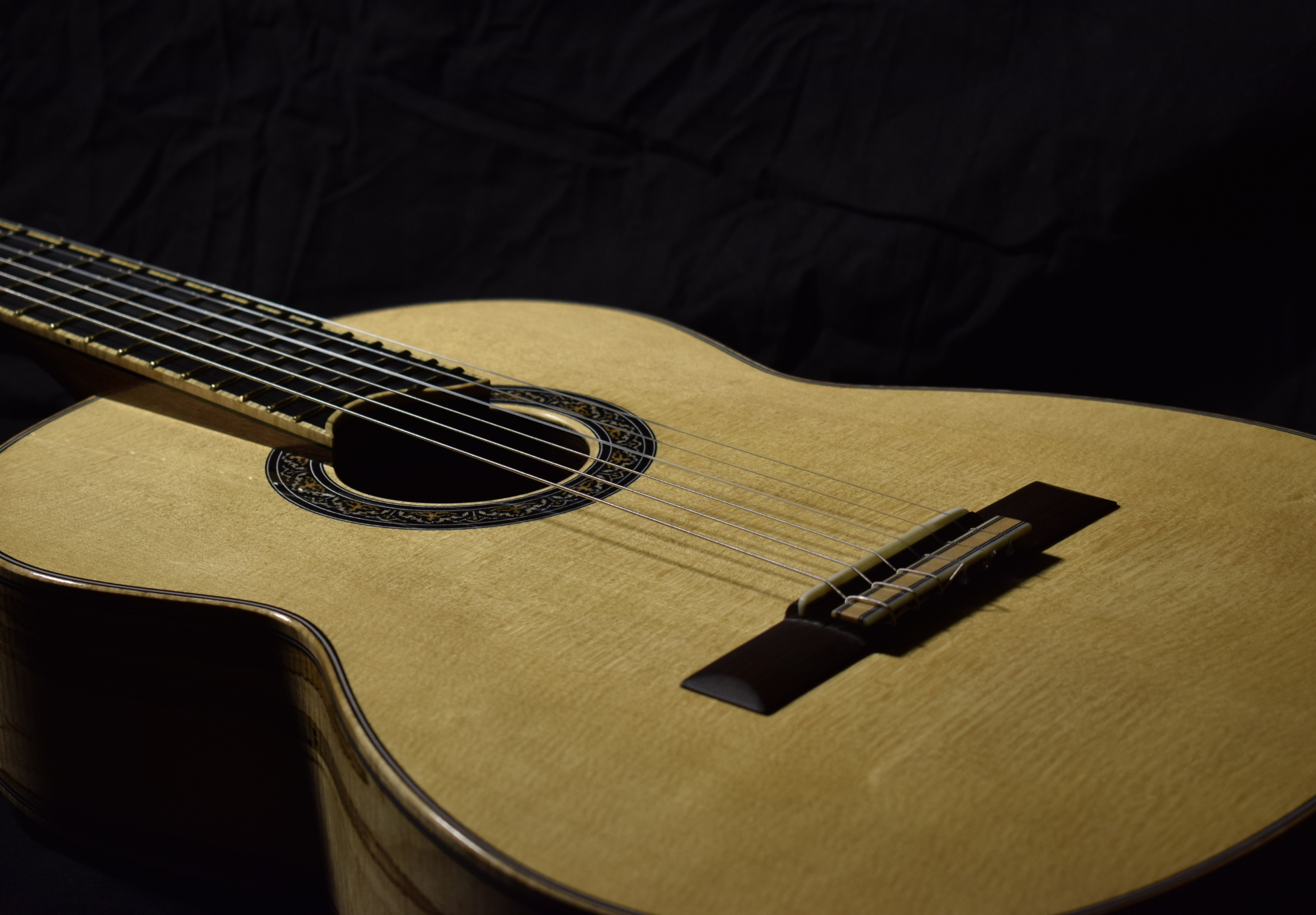 A five piece maple back, a black walnut headstock and a lutz spruce top