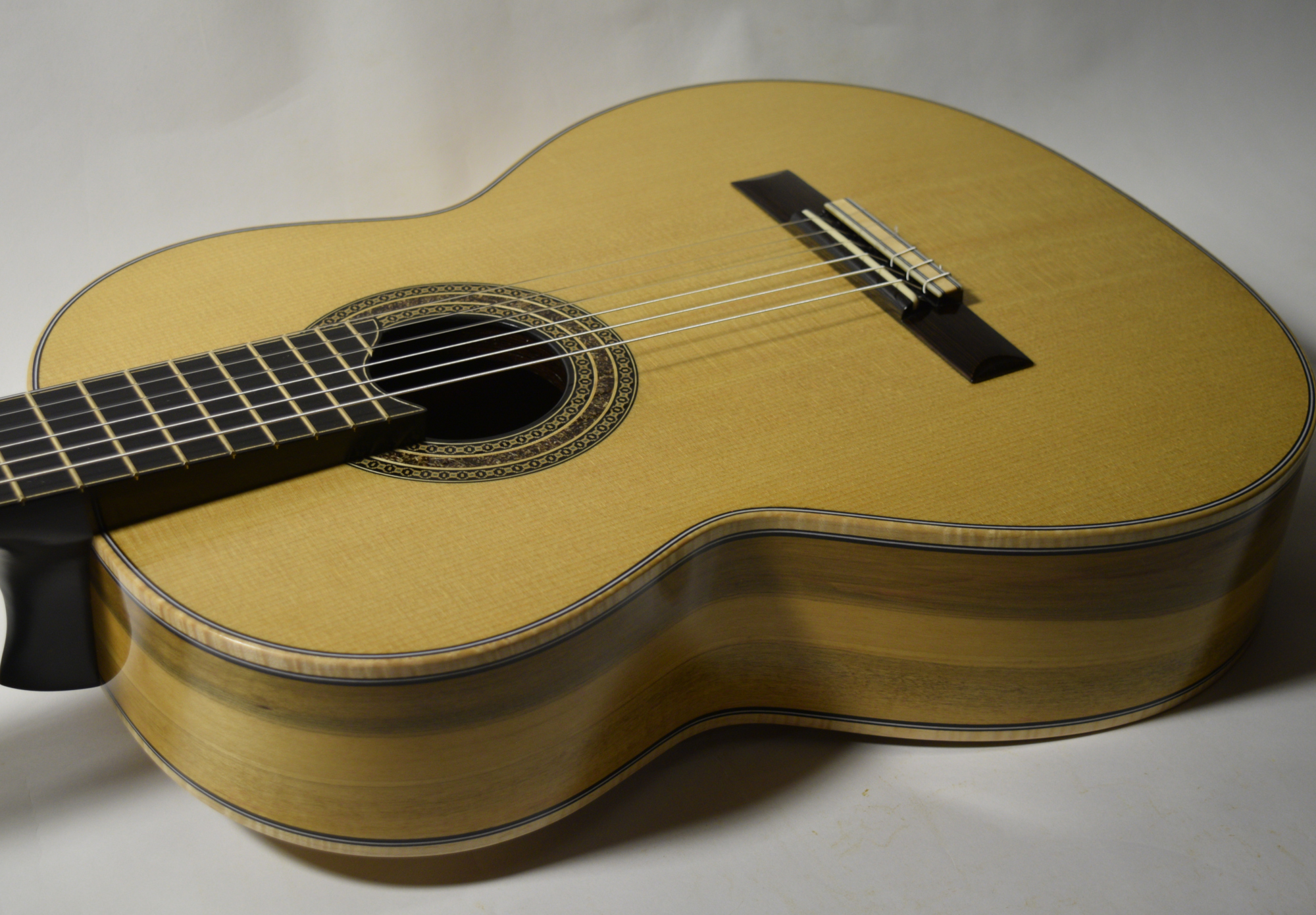 Maple binding with a black / white / black purfling highlight the colorful maple back and sides.