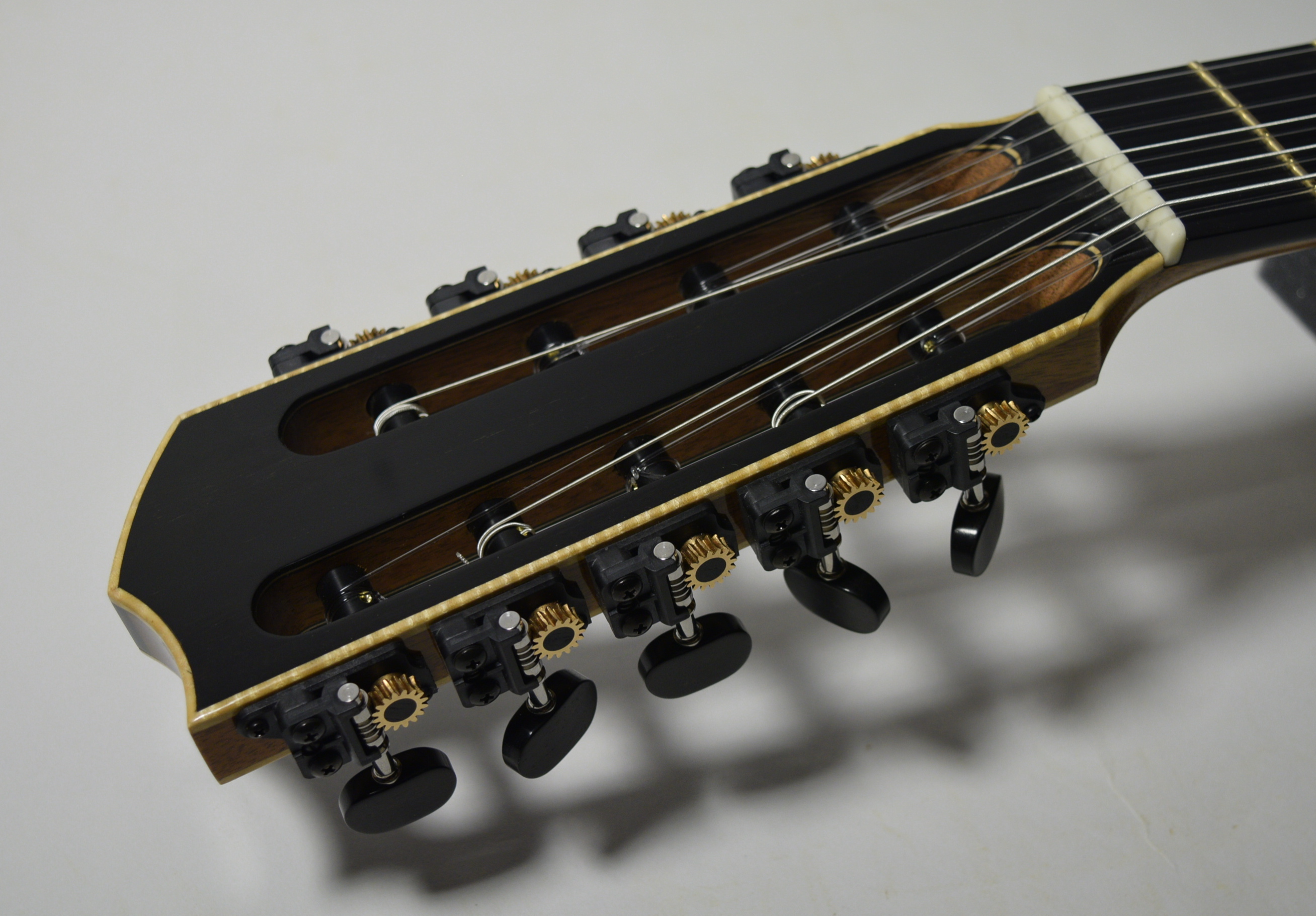 The full headstock with 5 strings on the bass side and 4 strings on the treble site. The tuning machines are Gilbert's design.