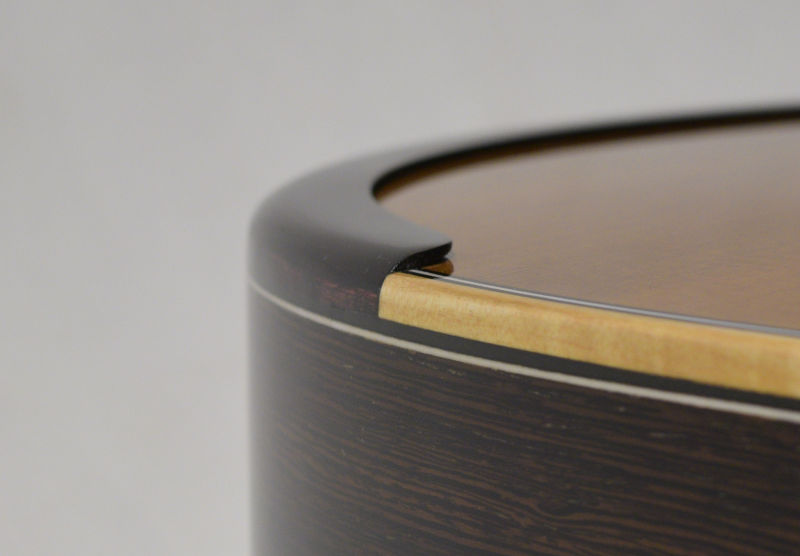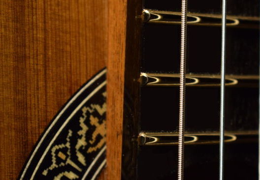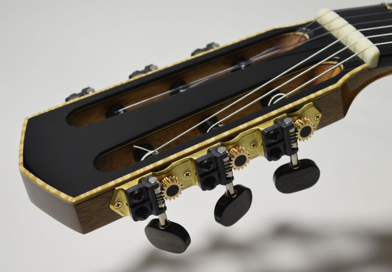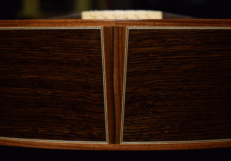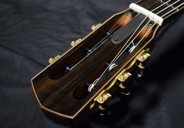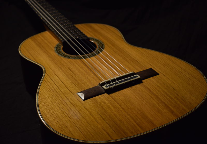 Elegy is built to be a modern, dependable tool for the concert hall. It uses a solid, cedar soundboard voiced for a traditional timbre using my own method of lattice bracing. The goal is for a fundamental resonance that remains salient and rich in the toughest performance settings, but not overly warm and "muddy". Clarity, balance and voice separation are key attributes of Elegy and I work very hard to ensure that it is both very responsive and resilient over time.