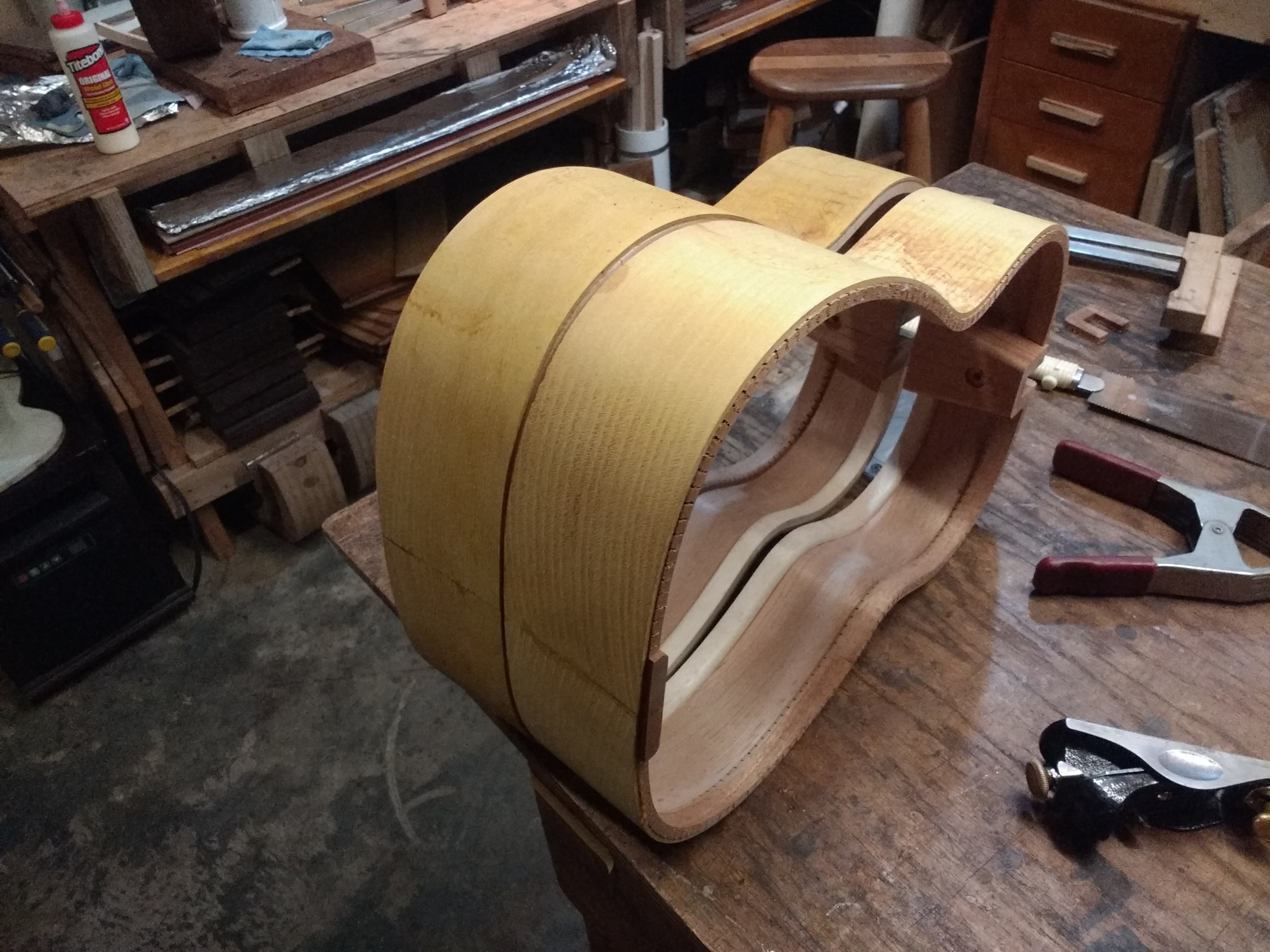 This Osage orange continues to be some of the finest tonewood for back and sides of guitars that I have ever handled. I remember the days I spent cutting it for firewood with my father and the impression its bright orange color first made on me. Early in my classical guitar playing days I dropped a small billet of this wood on the stone hearth around the stove in our cabin and noted the resulting metallic resonance. I wondered what kind of guitar it would create.